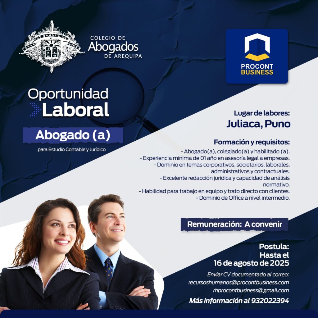 *El Colegio de Abogados de Arequipa informa que la presente convocatoria es difundida con el propósito de dar a conocer las diversas convocatorias laborales a sus agremiados. Sin embargo, la responsabilidad del proceso de selección, evaluación y contratación recae exclusivamente en la entidad convocante.