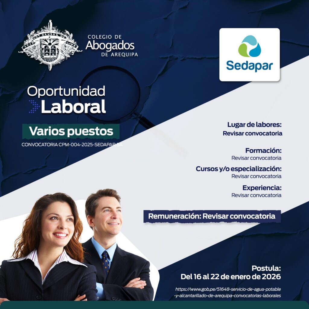 *El Colegio de Abogados de Arequipa informa que la presente convocatoria es difundida con el propósito de dar a conocer las diversas convocatorias laborales a sus agremiados. Sin embargo, la responsabilidad del proceso de selección, evaluación y contratación recae exclusivamente en la entidad convocante.