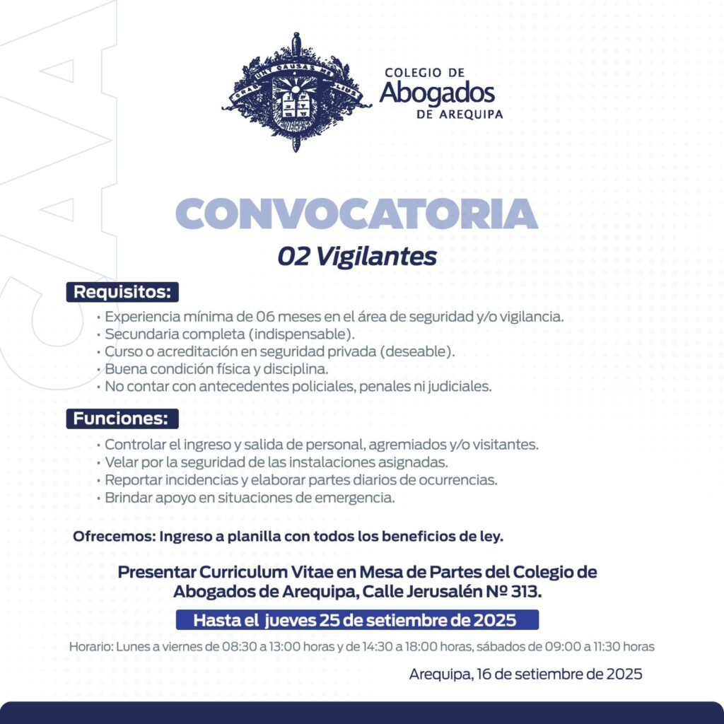BOLSA LABORAL: 02 VIGILANTES PARA EL COLEGIO DE ABOGADOS DE AREQUIPA