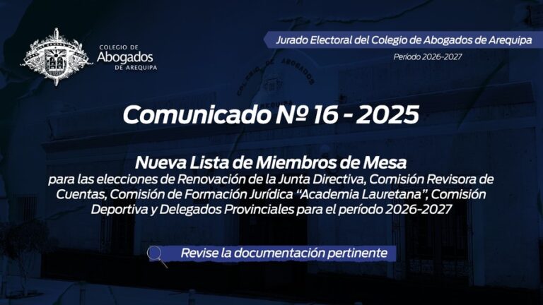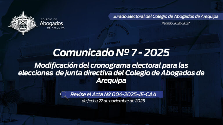 leer masComunicado Nº 007-2025 JE-CAA Ponemos de conocimiento a los miembros de la orden, la modificación del Cronograma Electoral para las elecciones de Junta Directiva del Colegio de Abogados de Arequipa, Período 2026-2027, el mismo que…