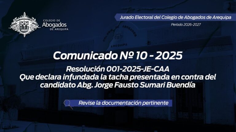 leer masComunicado Nº 010-2025 JE-CAA Ponemos de conocimiento de los miembros de la orden, la resolución N°001-2025-JE-CAA, en el cual se resuelve la tacha presentada en contra del candidato Jorge Fausto Sumari Buendia: View Fullscreen Descargue…