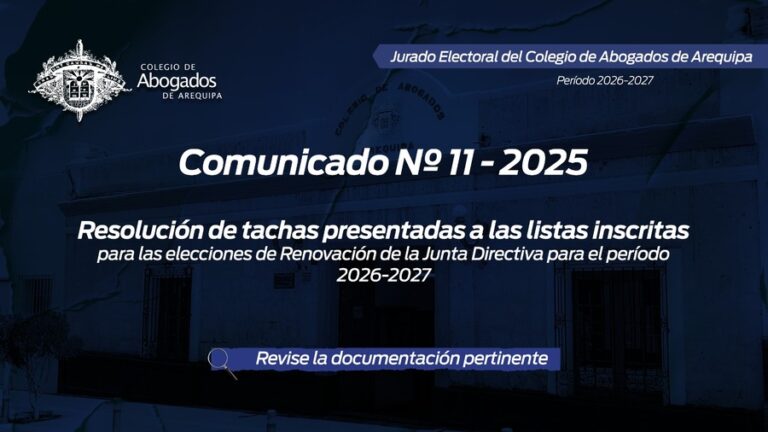 leer masComunicado Nº 011-2025 JE-CAA EL JURADO ELECTORAL DEL COLEGIO DE ABOGADOS, PONE EN CONOCIMIENTO, LAS RESOLUCIONES DE LAS TACHAS PRESENTADAS, A LAS LISTAS INSCRITAS PARA LA RENOVACIÓN DE LA JUNTA DIRECTIVA PERIODO 2026 – 2027…