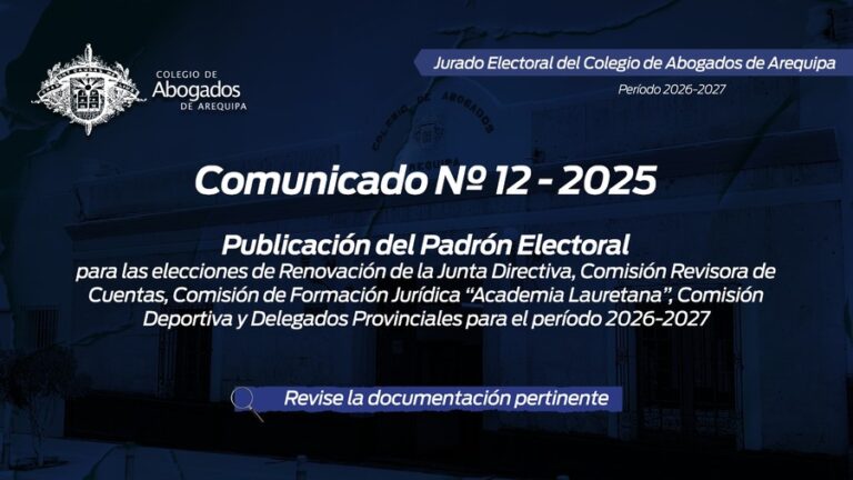 leer masComunicado N.º 012-2025 JE-CAA EL JURADO ELECTORAL DEL COLEGIO DE ABOGADOS, PONE EN CONOCIMIENTO DE LOS MIEMBROS DE LA ORDEN, EL PADRÓN ELECTORAL DE LOS AGREMIADOS HABILITADOS, A EFECTO DE EJERCER SU DERECHO AL VOTO…