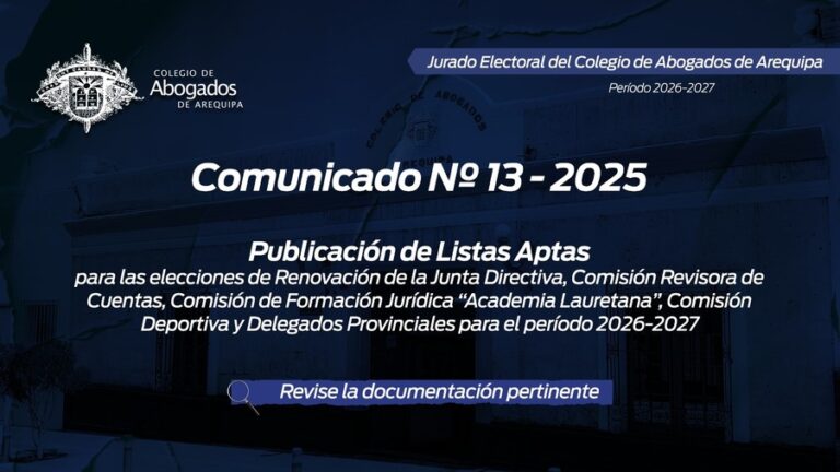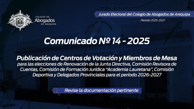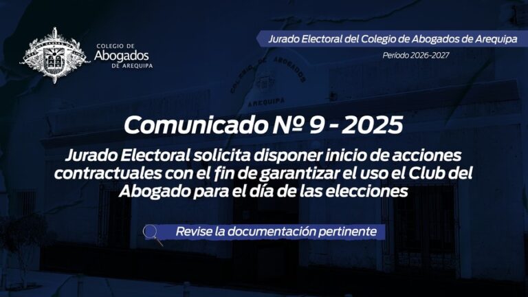 leer masComunicado Nº 009-2025 JE-CAA Actuando con la debida transparencia, el Sr. Presidente del Jurado Electoral del Colegio de Abogados de Arequipa pone de conocimiento de los agremiados lo siguiente: Descargue documentación