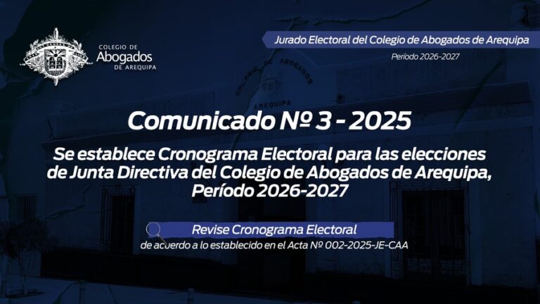 leer masComunicado Nº 003-2025 JE-CAA Ponemos de conocimiento de los miembros de la orden, el Cronograma Electoral para las elecciones de Junta directiva del Colegio de Abogados de Arequipa, Período 2026-2027, el mismo que ha sido…