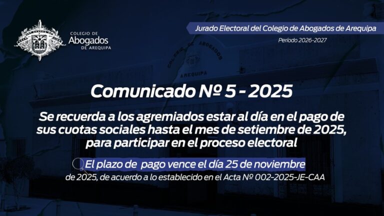 leer masComunicado Nº 005-2025 JE-CAA Se recuerda a los agremiados estar al día en el pago de sus cuotas sociales hasta el mes de setiembre de 2025, para participar en el proceso electoral. El plazo de…
