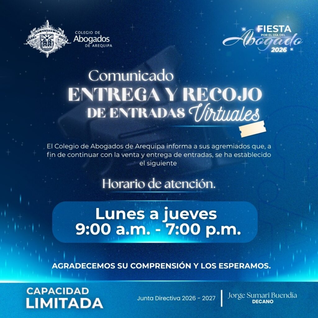 ¡Atención agremiados! Continúa la entrega y recojo de entradas virtuales para la Fiesta del Día del Abogado 2026 Lunes a jueves 9:00 a.m. – 7:00 p.m. Capacidad limitada ¡Los esperamos!