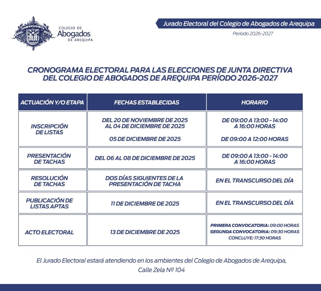 Ponemos de conocimiento de los miembros de la orden, el Cronograma Electoral para las elecciones de Junta directiva del Colegio de Abogados de Arequipa, Período 2026-2027, el mismo que ha sido establecido de acuerdo al Acta Nº 002-2025-JE-CAA.