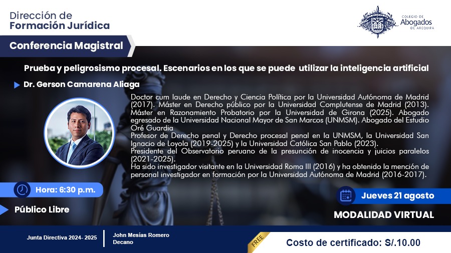 Descúbrelo en la Conferencia Magistral gratuita del Colegio de Abogados de Arequipa con el Dr. Gerson Camarena Aliaga. Profesor de Derecho Penal de la Universidad Católica San Pablo.