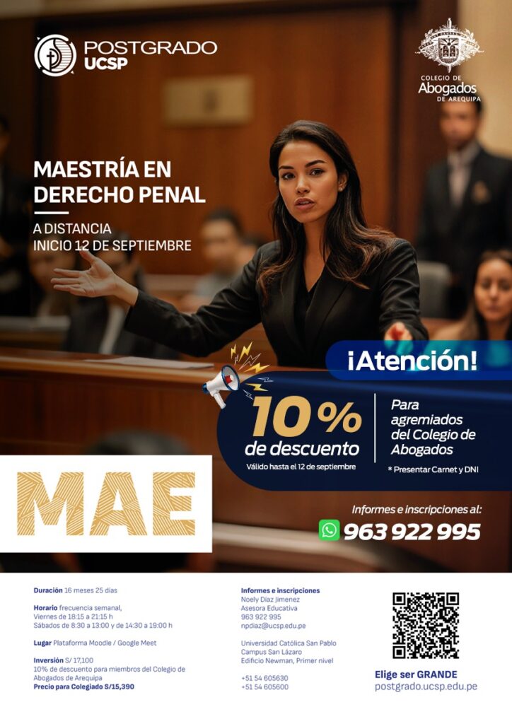 Postgrado UCSP Postgrado UCSP https://www.caa.org.pe/wp-content/themes/caarequipa/images/empty/thumbnail.jpg 150 150 Sistemas Sistemas https://secure.gravatar.com/avatar/a0bb276db84b54af3f2dcafdec208124ac5f95e0503dbc5fe96520ec00a24d32?s=96&d=mm&r=g 13 agosto, 2025 13 agosto, 2025 Vigente hasta: 12 de setiembre del 2025 Aplica para: Abogados agremiados al CAA. Para hacer uso de estos beneficios, necesariamente tendrá que exhibir su carnet de abogado y su DNI. Comunicarse al: 963922995 MÁS INFORMACIÓN